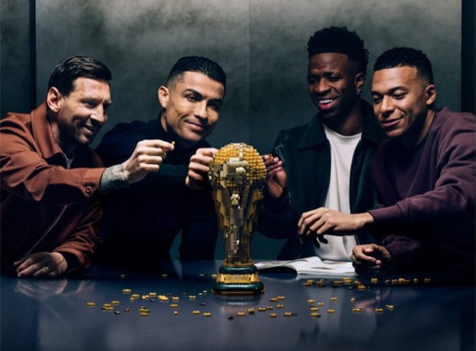 A LEGO reuniu quatro dos maiores nomes do futebol mundial — Cristiano Ronaldo, Lionel Messi, Kylian Mbappé e Vinícius Júnior — numa campanha promocional dedicada ao Mundial de 2026.