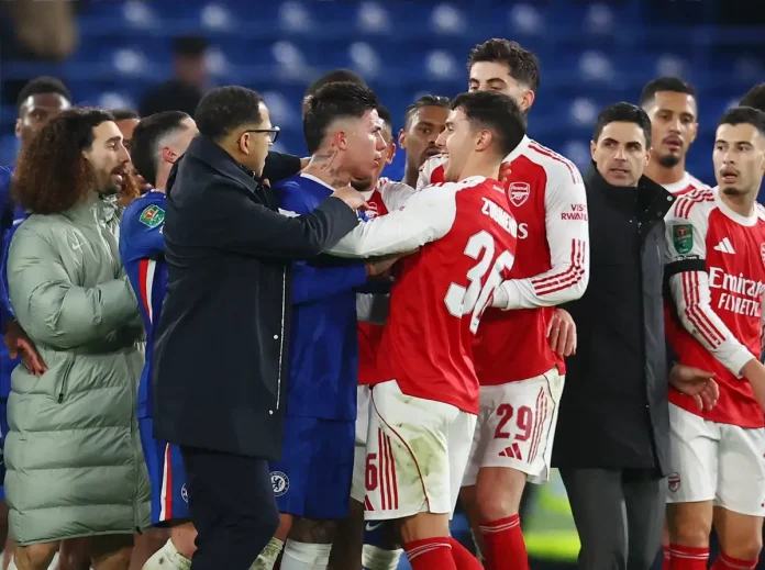 Arsenal triunfou de forma dramática sobre o Chelsea, garantindo uma vitória crucial por 3-2 no primeiro jogo das meias-finais da Taça da Liga, mas o que deveria ser uma celebração transformou-se numa cena de tensão. O apito final não apenas selou o resultado, mas também desencadeou um confronto intenso entre Martin Zubimendi, o herói do Arsenal, e Enzo Fernandes, o capitão do Chelsea.